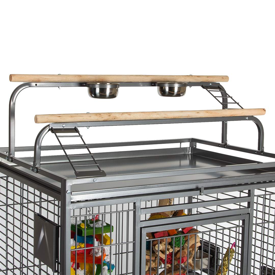 The new door lock as well as the new lining door locking system and the super stable metal rollers set new accents. The playground roof now has two floors and thus offers even more play options for our feathered friends. We deliver the new Hacienda Play with a playground roof including a perch, four outer lining doors with stainless steel bowls, a nesting box door and a collection apron that prevents leftover food from falling out. The Hacienda Play with playground roof also has a removable manure grid and a removable drawer underneath the playground.